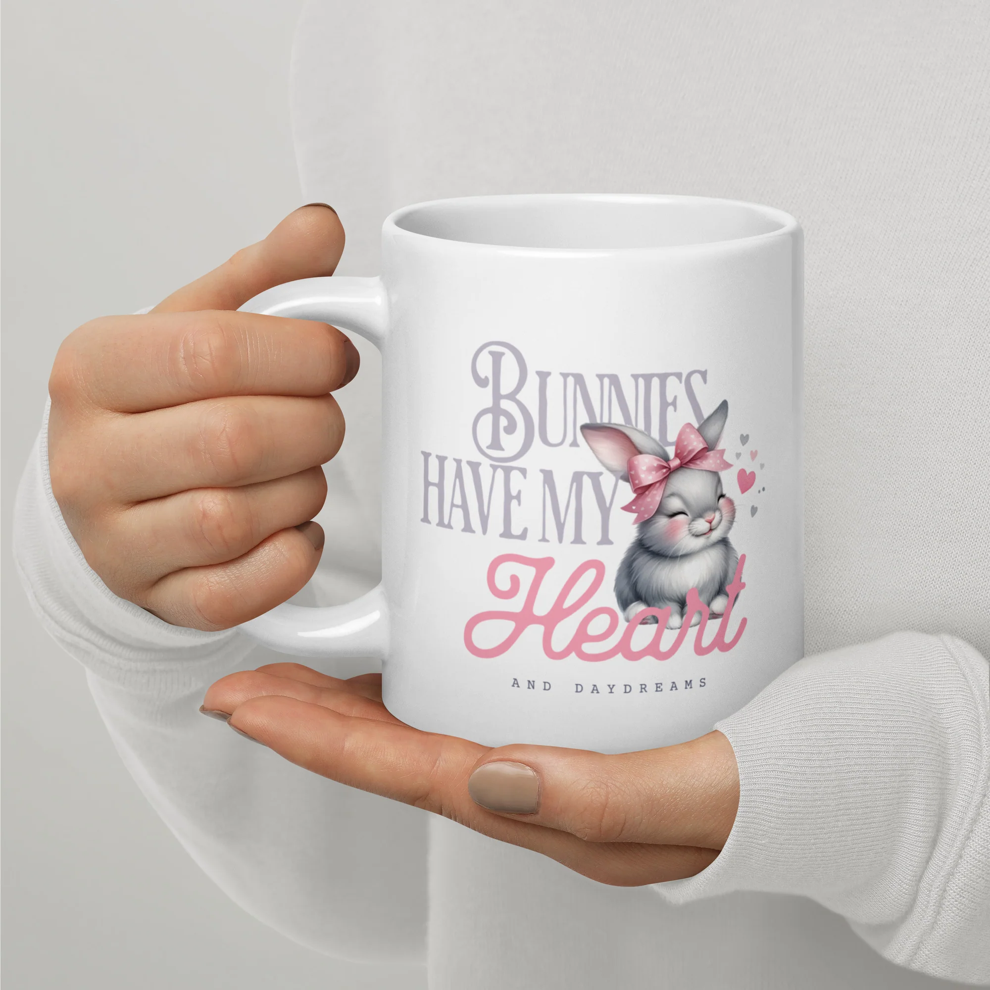 Celebrate where your heart is with this charming white glossy mug! Adorned with an adorable bunny design and the sentimental message, "Bunnies Have My Heart and Daydreams", it's perfect for sipping your favorite beverage while showcasing your unique personality. Ideal for bunny enthusiasts, this mug makes a delightful gift or a lovely addition to your own collection.