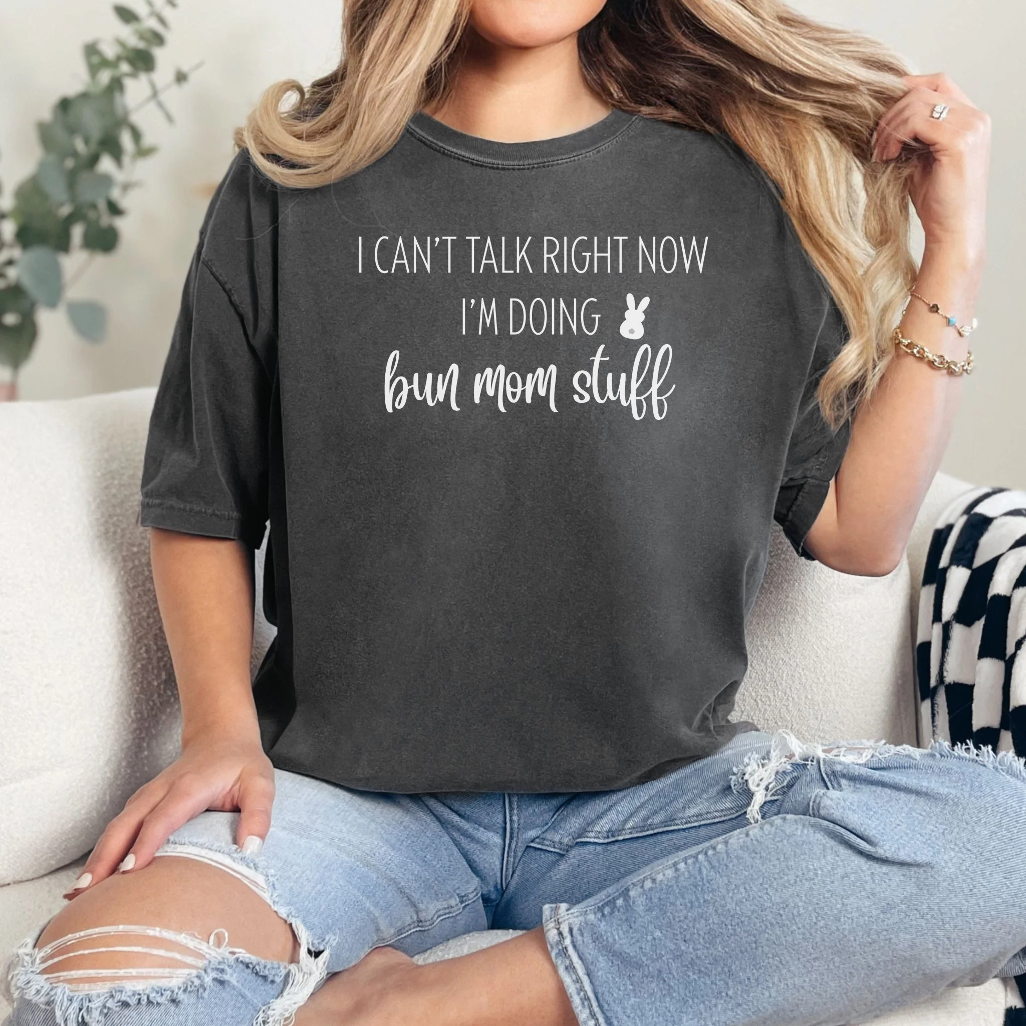 This tee is perfect for all the bun moms out there who juggle life with flair! Featuring the playful phrase "I can't talk right now, I'm doing bun mom stuff," it combines comfort and attitude effortlessly. Made from soft, breathable fabric, this t-shirt keeps you cozy while showcasing your fun personality. Whether you're running errands or enjoying a casual day out, this trendy piece is a must-have for your wardrobe. Embrace your bun mom status and make a statement with this chic tee!