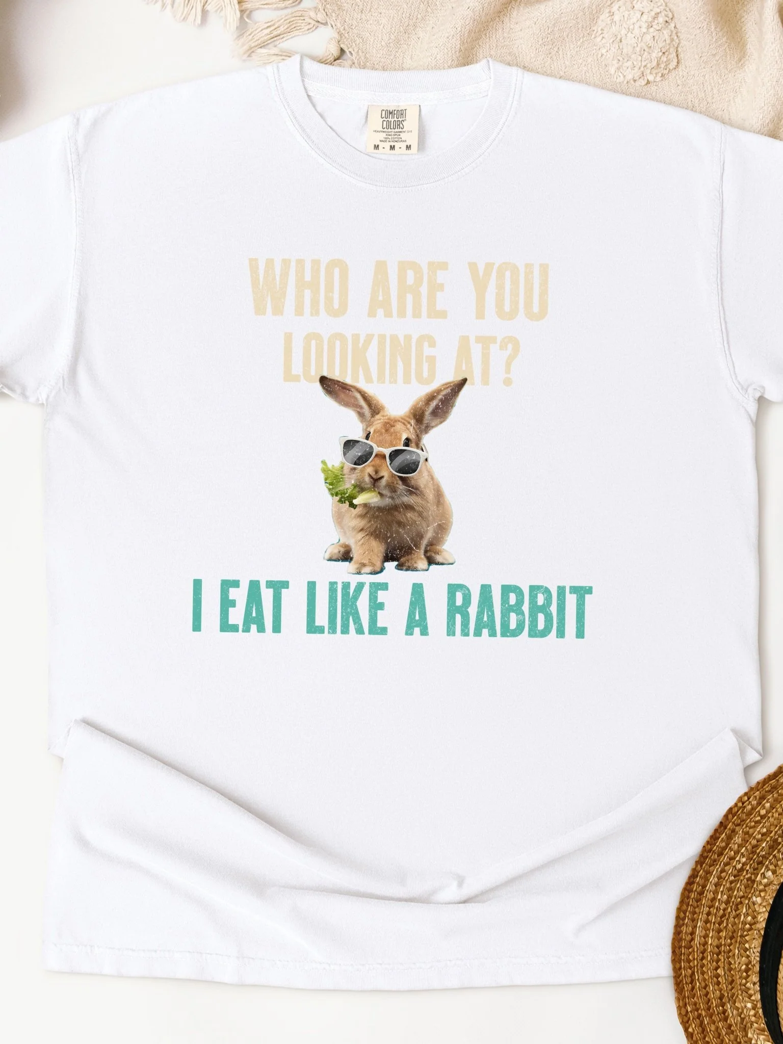 Take a look at this playful shirt that boasts the amusing phrase, "Who are you looking at? I eat like a rabbit!" Ideal for those with a lighthearted sense of humor, this shirt is sure to spark conversations. Whether you're relaxing at home or hanging out with friends, it brings a comical flair to your outfit while expressing your fondness for all things veggies (or not!?).