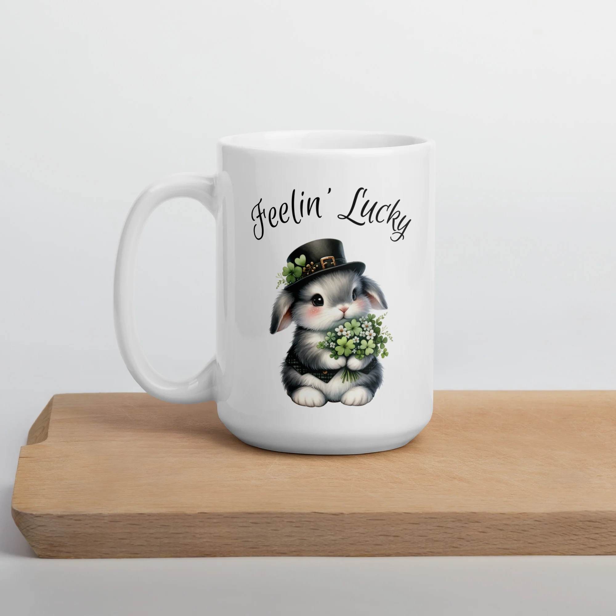 Brighten your day with this charming mug featuring an adorable bunny wearing a hat and proudly holding a bouquet of four-leaf clovers. The glossy white finish showcases the playful design and the uplifting text "Feelin' Lucky," making it a perfect gift for yourself or a loved one. Enjoy your favorite beverage while embracing a little luck and whimsy!