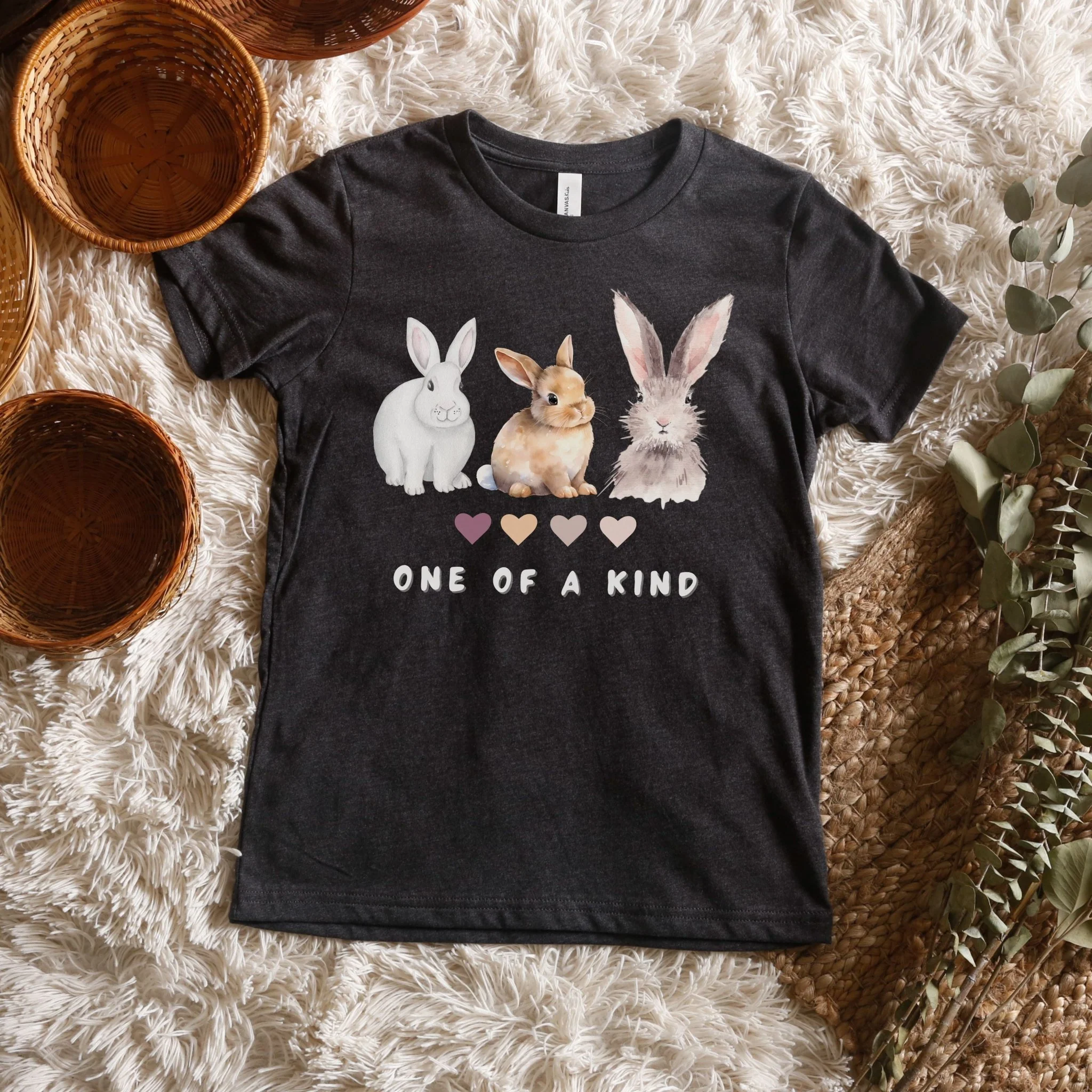 Check out this one-of-a-kind bunny tee, perfect for the young trendsetter in your life! Made with soft, comfy fabric, this unique shirt features an adorable bunny design that stands out from the crowd. It's not just a shirt; it's a statement piece that adds a fun touch to any outfit. Grab this youth-sized gem and let your little one hop into style!