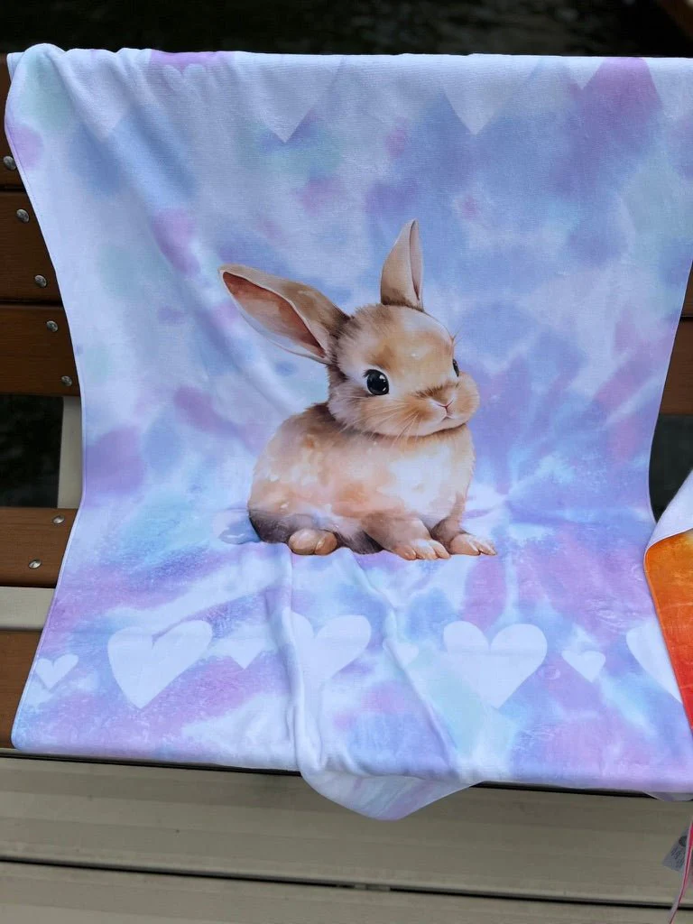 Introducing the ultimate summer accessory: a vibrant towel featuring a sweet bunny on a fun tie dye colors. Perfect for beach days, pool parties, or picnics, this towel not only showcases your love for fun and style but also adds a playful touch to your outdoor adventures. Made from soft, absorbent material, it's designed for comfort and durability, making it a must-have for anyone looking to make a statement while soaking up the sun.Â